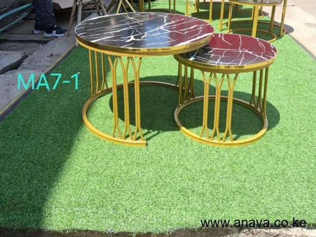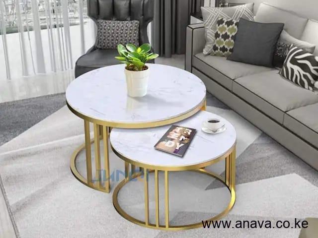 New design * ‼️‼️*Nesting Coffee Table Marble Effect (MDF) ▫️ Price ‼️ 8,500kshs➖ Size:70cm and 50cm diameter.➖ Gold Metal leg design ➖Round Coffee  Nesting table set ▫️Colour: Black ▫️Colour: White
