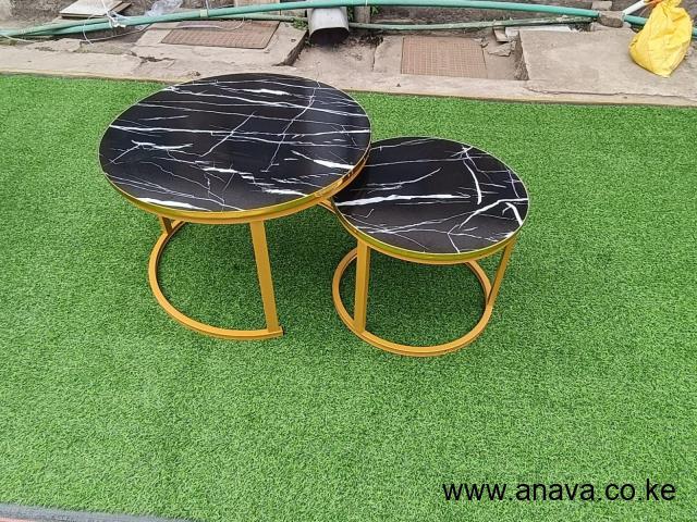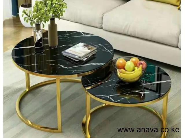 Nesting Coffee Table Marble Effect (MDF) ▫️ Price;‼️ 8,999 kshs➖ Size:70cm and 50cm diameter.➖ Gold Metal leg design ➖Round Coffee  Nesting table set ▫️Colour: Black